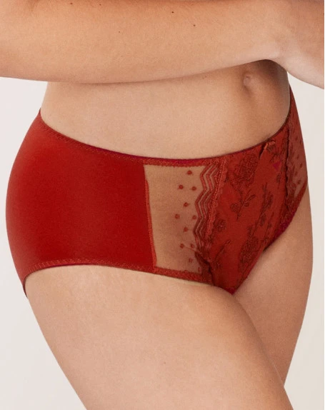 La culotte Empreinte de la collection Ellen propose une forme taille haute avec une ceinture qui monte sur le ventre. Ce modèle est légèrement transparent sur le devant et les hanches sont ornées de dentelle transparente, ce qui offre un look séduisant au modèle.