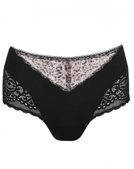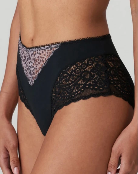 Magnifique culotte taille haute en dentelle graphique et à imprimé animalier original. Des lignes épurées donnent à ce bas un look moderne.