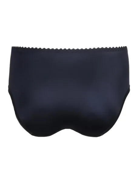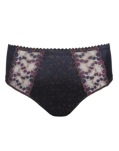 Une culotte taille haute féminine en tissu imprimé doux affichant des bandes verticales de broderie sur le devant.