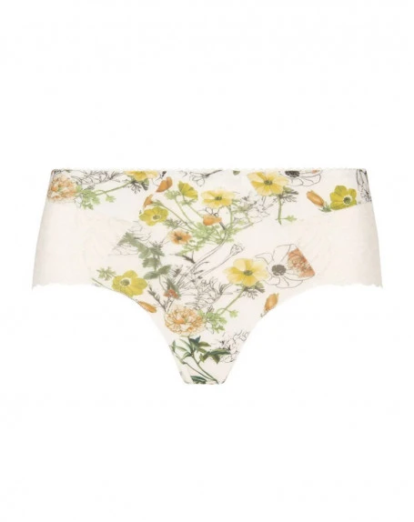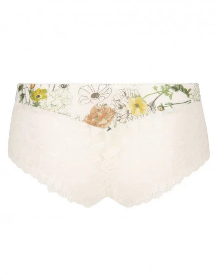 Le shorty Antigel de la collection Liberté en Fleur offre une bordure élastique en polyamide élasthanne fantaisie à ponts, elle souligne délicatement la taille et s’harmonise avec le motif fleuri. Les modèles sont féminisés par un fin galon de dentelle Jacquard au dessin végétal.