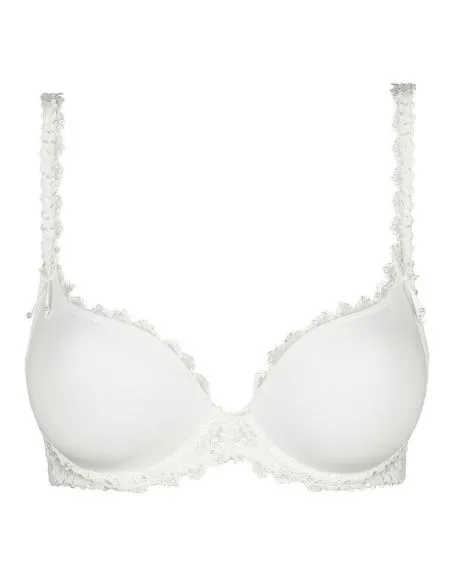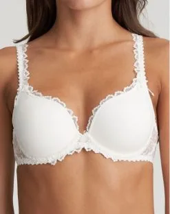 Le décolleté de ce modèle de soutien-gorge Marie Jo ressemble à la pointe d’un cœur. Le bonnet commence très bas au creux des seins pour remonter haut sur le côté du bonnet, avec un effet assez enveloppant. La ligne de décolleté est bordée d’un galon de broderie qui épouse parfaitement les contours de la poitrine.
