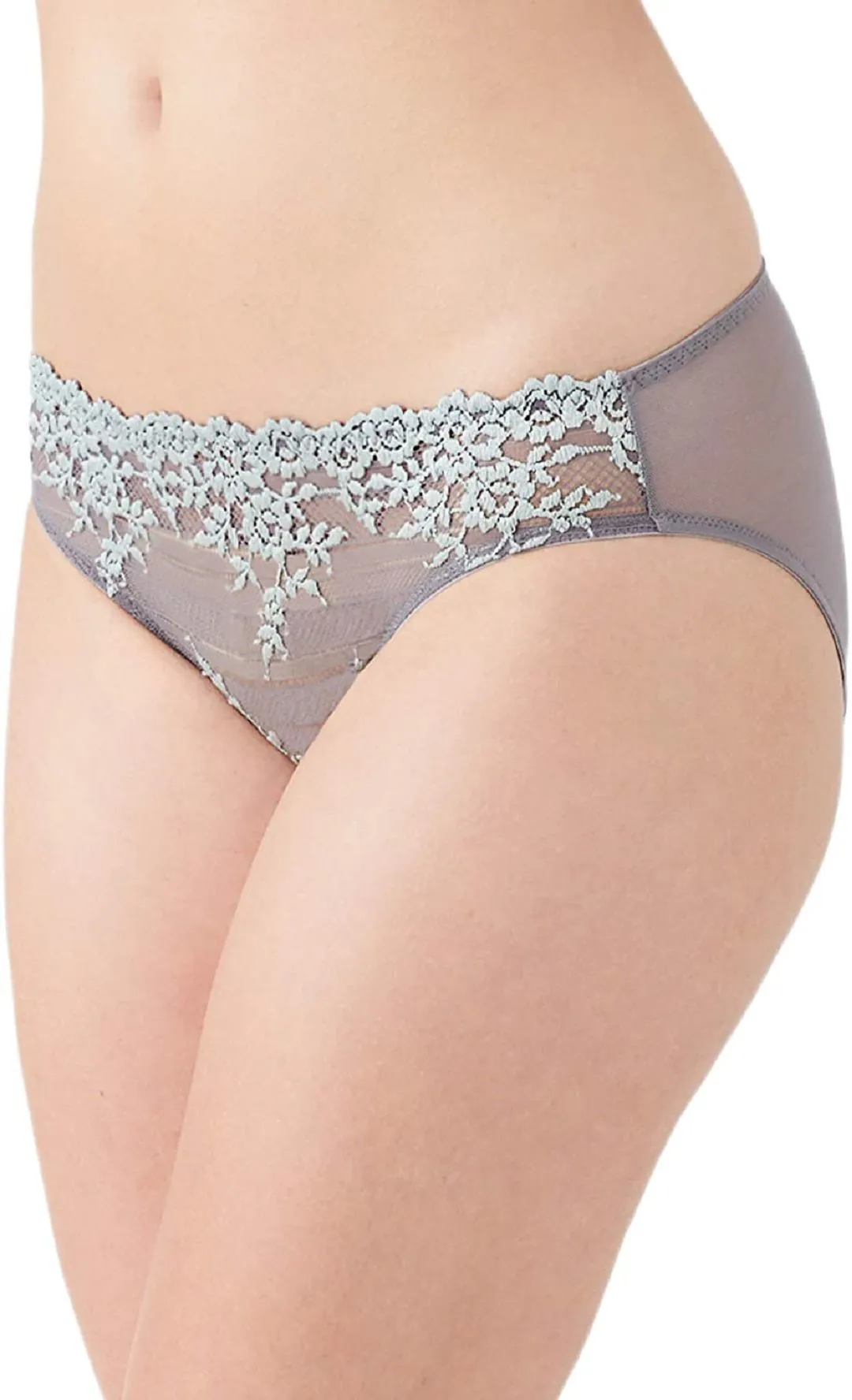 Une culotte taille basse en dentelle. La fesse est recouverte par un lèger filet.